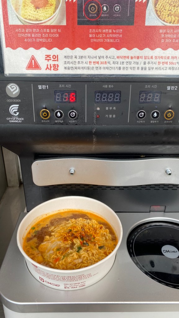 Buy your packet ramyun from any convenience store (7-11 / GS25 / CU)., and grab an egg or cheese slice at the counter. The cashier will give you a big paper bowl to cook in. Then, head to one of the machines outside the store. Pour everything into the paper bowl, press a few buttons and you’re done!
